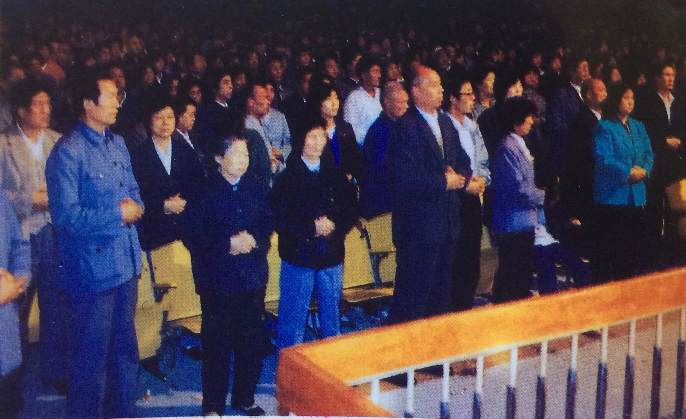 In Xi'an, China: More than three thousands people taking Taoist Light Qigong class at a time. Class held in University Auditorium.